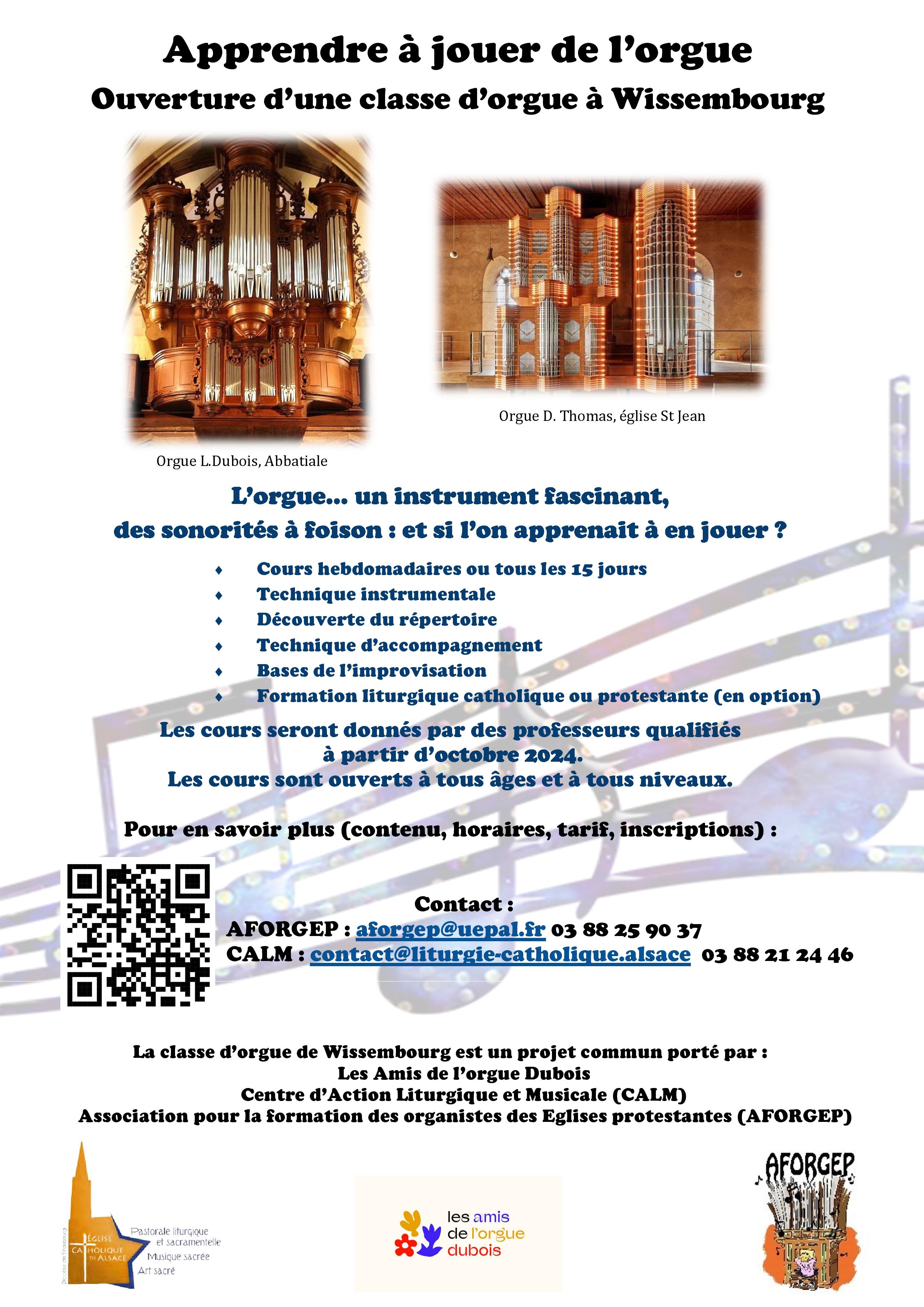 Le Centre d’Action Liturgique et Musicale (CALM) et l’Association pour la formation des organistes des Eglises protestantes (AFORGEP) proposent conjointement des cours d’orgue à Wissembourg à partir d’octobre 2024.